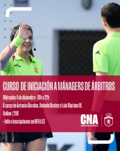 El Comité Nacional de Árbitros (CNA) anuncia la apertura de inscripciones para el Curso de Iniciación de Managers de Árbitros, una formación clave para quienes aspiran a desempeñar este importante rol en el ámbito deportivo. El curso será a cargo de: Antonio Morales, Antonio Bustos y Luis Mariano M. y se llevará a cabo el próximo miércoles 4 de diciembre, de 19:00 a 22:00 horas.