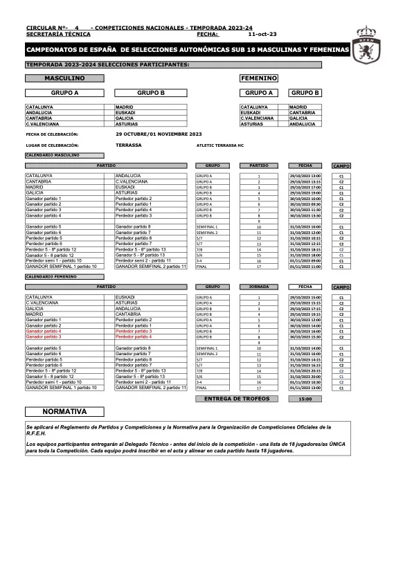 EL ATLÈTIC TERRASSA HC ACOGE EL CAMPEONATO DE ESPAÑA DE SELECCIONES AUTONÓMICAS SUB-18