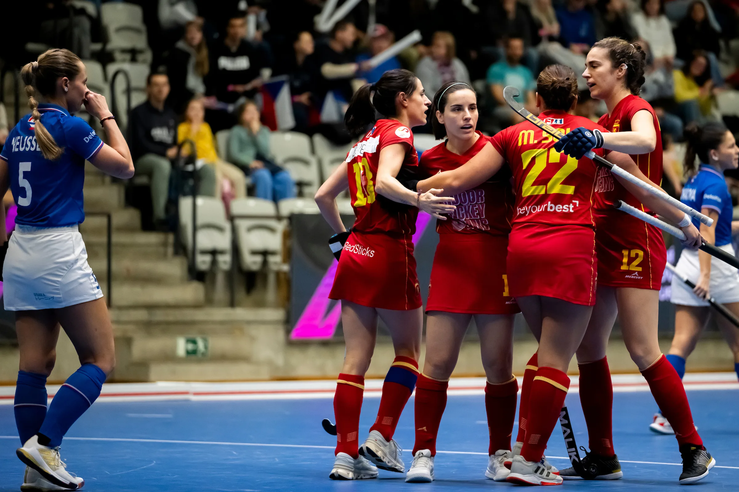 En el partido de hoy han tenido que jugar contra el equipo de Tomas Procházka y contra un animoso público que no ha dejado de animar a las suyas. Comenzaba el partido con un gol en contra, el de Nikol Babická en el minuto 3, neutralizado por el tanto de Bea Pérez justo antes de que acabara el primer cuarto. También antes de que acabara el segundo cuarto anotó España. En este caso fue Clara Ycart la que batió a Barbora Cecháková para subir el 1-2. Una bonita triangulación entre Natálie Novákova, que se internó por la izquierda, y Adéla Lehovcová acabó con el disparo a puerta de Babická que significó su segundo tanto y el dos a dos en el electrónico.