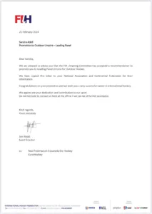 Este mes de febrero, la Federación Internacional de Hockey (FIH) ha anunciado las promociones arbitrales destacando el ascenso de la árbitra española Sandra Adell al máximo nivel internacional, el Leading Panel.