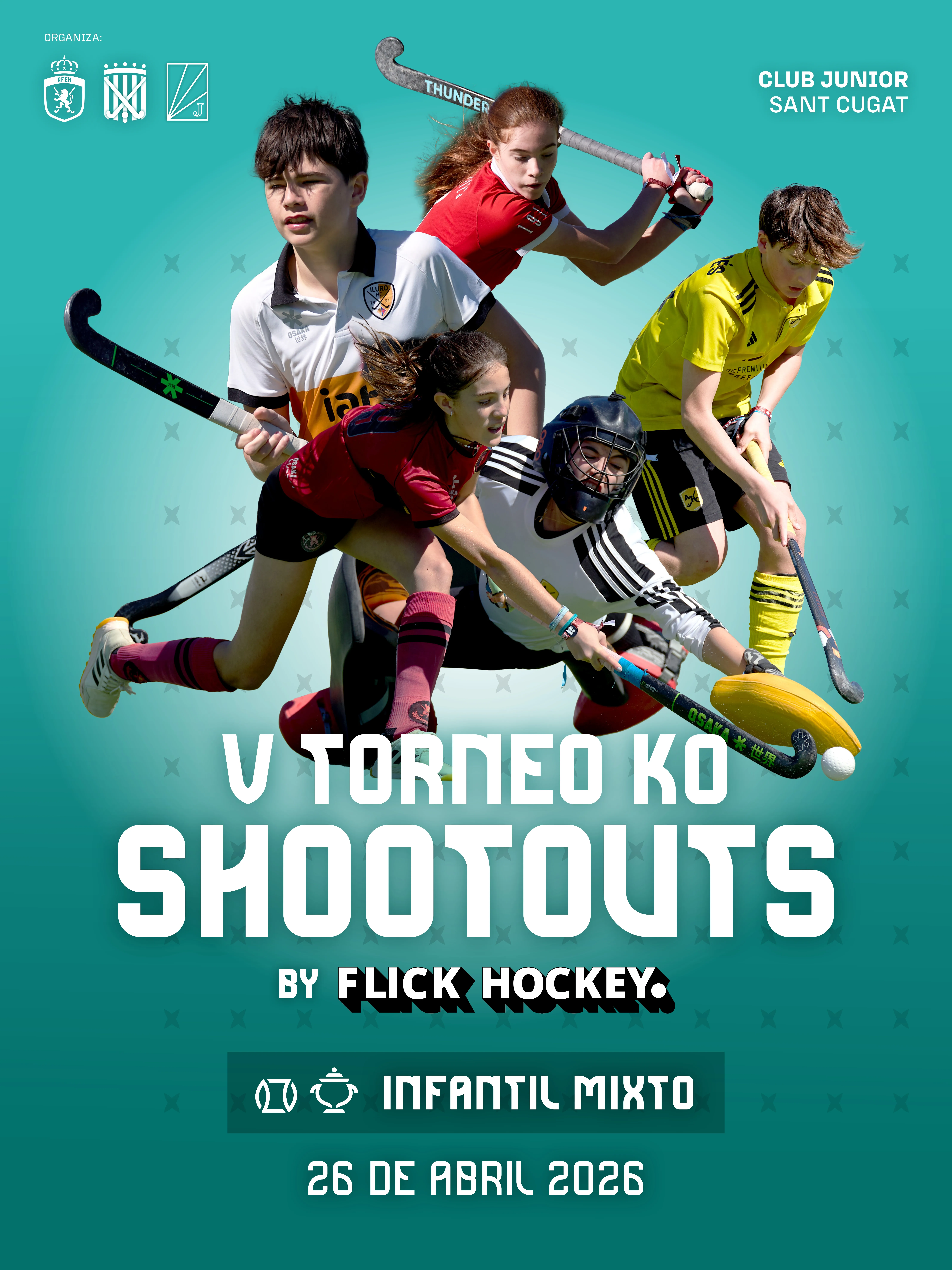 Llega la quinta edición del Torneo KO ShootOuts Infantil mixto BY FLICK HOCKEY. La competición se celebrará durante la Copa del Rey y de la Reina Iberdrola 2026, que tendrá lugar en el Club Junior del 24 al 26 de abril.