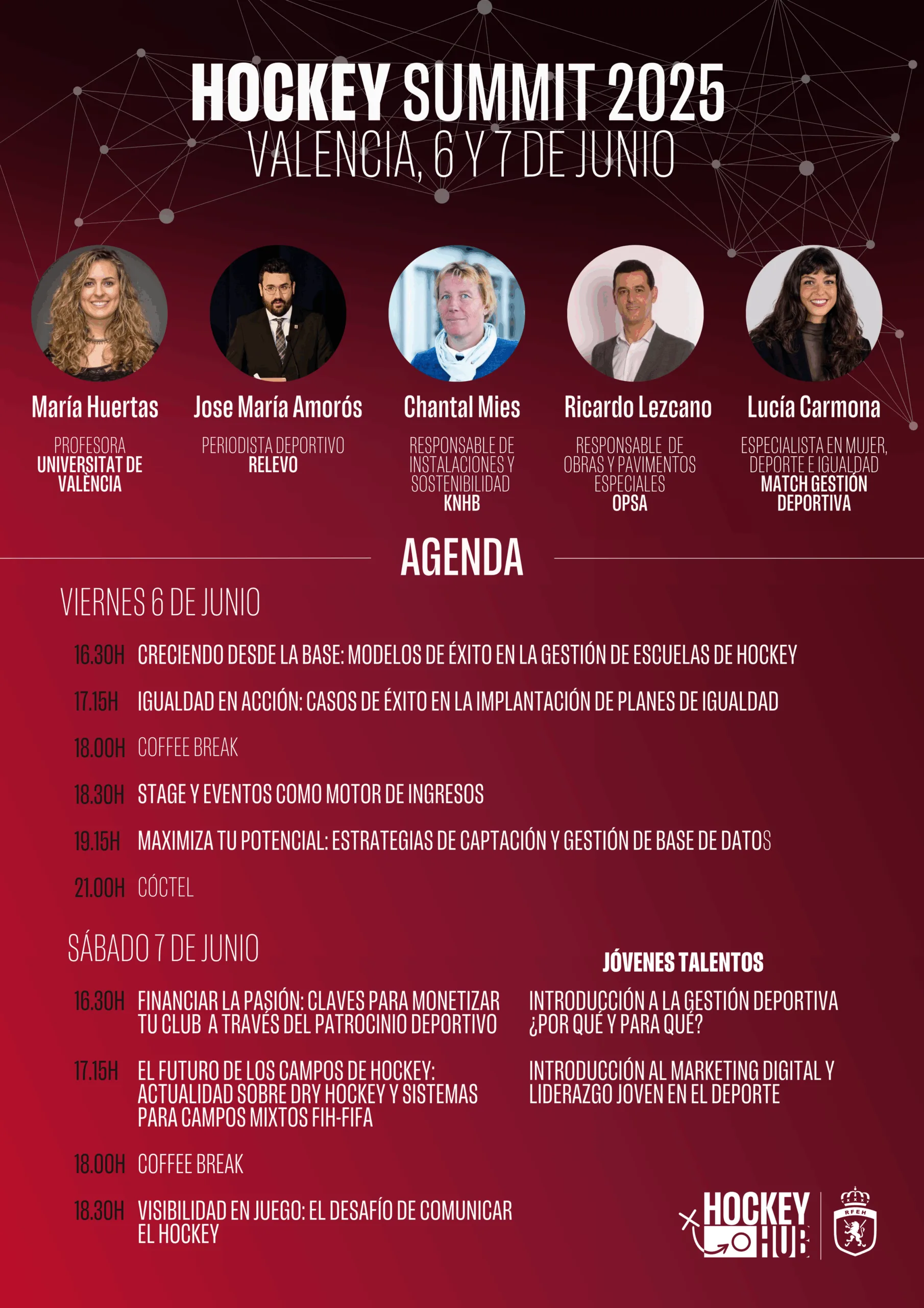 Entre los ponentes destacados figuran María Huertas, profesora de la Universitat de València; Jose María Amorós, periodista de Relevo; Chantal Mies, responsable de instalaciones y sostenibilidad en la KNHB; Ricardo Lezcano, de OPSA; y Lucía Carmona, especialista en mujer, deporte e igualdad en Match Gestión Deportiva.
